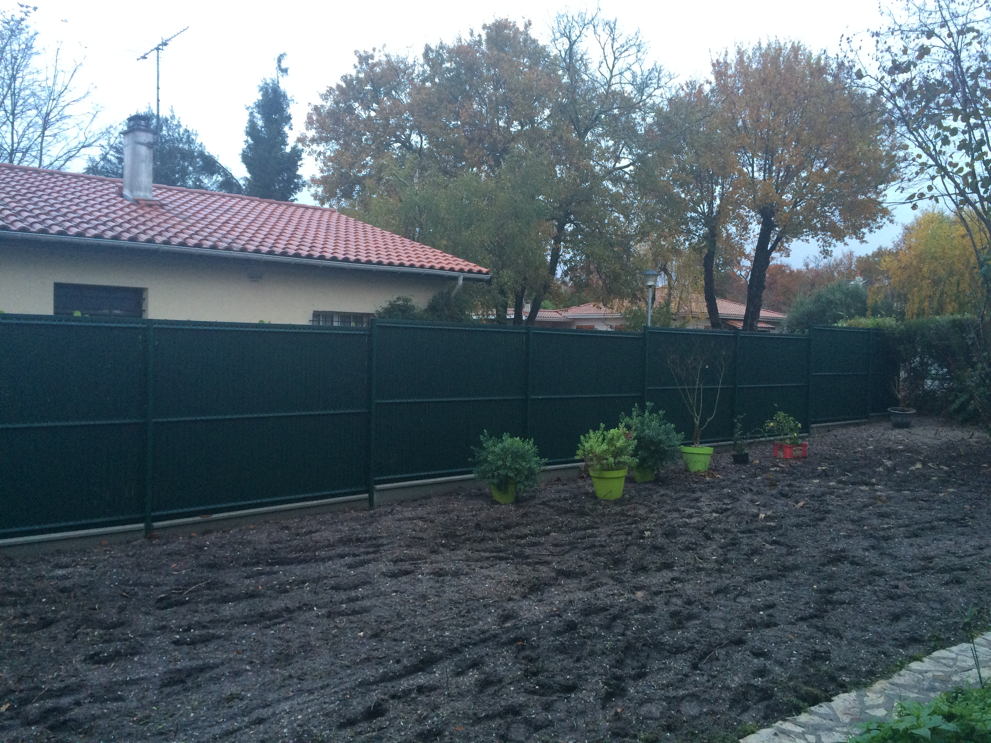Fourniture et pose d'une clôture en Panneau Rigide couleur Vert, d'une hauteur de 1m53 avec plaques de soubassement de 0m25 et Occultation ht 1m53 couleur VERT, sur la commune de ST MEDARD EN JALLES (33), en Gironde.